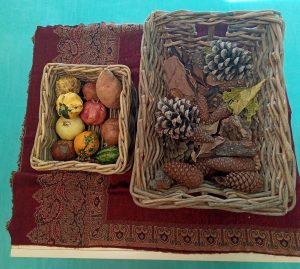 A les estances, igualment, tenim petits racons amb elements propis d’aquesta època que anem recopilant gràcies a la vostra ajuda: pinyes, magranes, fulles, castanyes, carbasses, etc. Manipulant-los podem veure les propietats d’aquests, colors, formes, gust, etc. I de vegades fins i tot, ens en duem alguna sorpresa, com amb la castanya, ja que els hi va despertar molta curiositat ¨l’abric¨ de punxes que té.