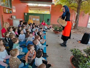 El dia de la festa, la Castanyera ens ha vingut a visitar i és ella qui ens ha representat el conte!,  però com que estava una mica despistada, entre tots i totes l’hem ajudat a distingir les castanyes dels cargols amb banyes!, ha sigut molt divertit!.
