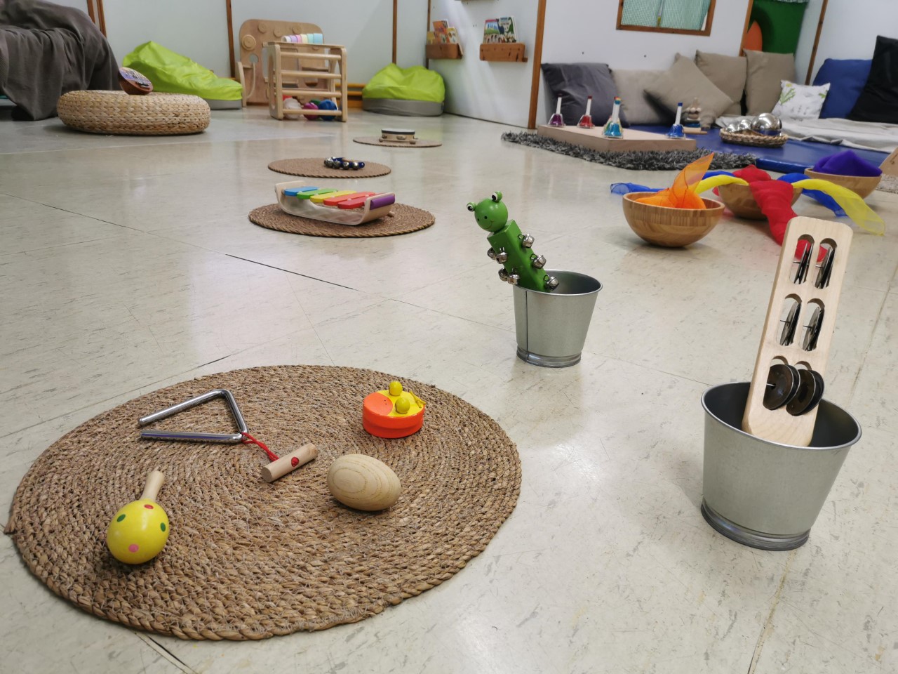 – Si teniu algun instrument a casa, podeu oferir-li una panera amb els que pugueu aconseguir o fins i tot crear-ne algun (tipus maraca amb un pot de iogurt i arròs)… Distribuir-los per l’espai, tot classificant-los (maraques, tambors…) en petits racons fa que s’hagin de desplaçar per a tocar uns instruments o uns altres i els combinin entre ells segons el seu interès.