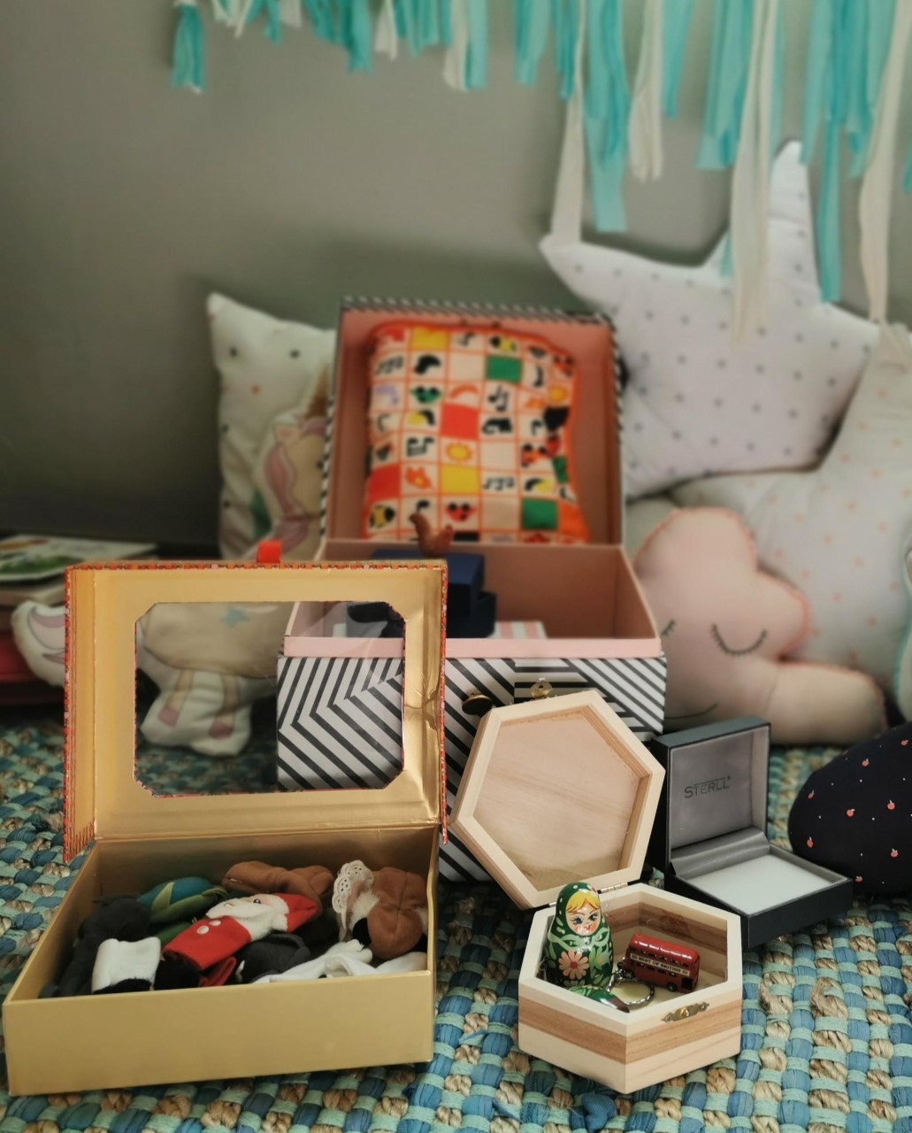 Les capsetes musicals que poden ser creades amb material de rebuig (de galetes, bombons, sabates, caramels, joguines, joies…), en les quals un element de la cançó, el més característic (real, dibuixat, titella, creat… com per exemple, un cargol, una petxina, un elefant…) està amagat a dins, com un tresor. Els emociona molt el poder trucar a dins la capsa i esperar amb il·lusió (l’efecte sorpresa) el què s’amaga a dins.