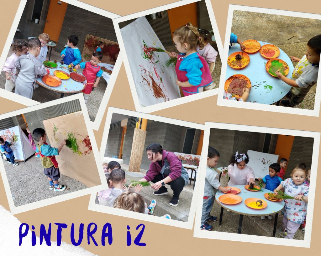 En aquestes propostes de pintura els infants d’I2 fan servir estris de pintura naturals, elaborats amb fulles de coníferes i fruites de la tardor.