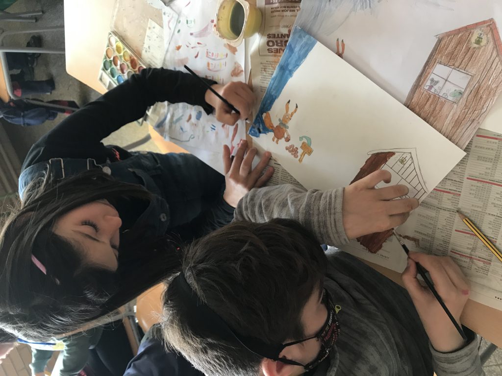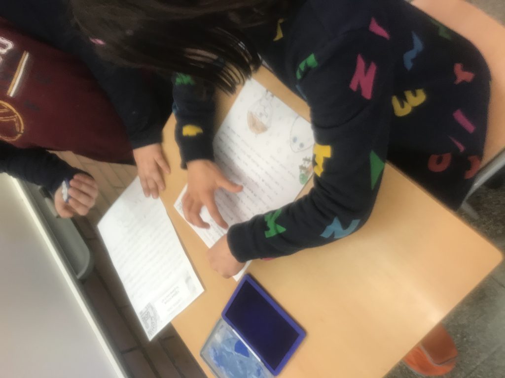 Després de llegir i descobrir l’història del “primer cas” ens posem a treballar, per parelles, en els dibuixos que il.lustraran el nostre Kamishibai.