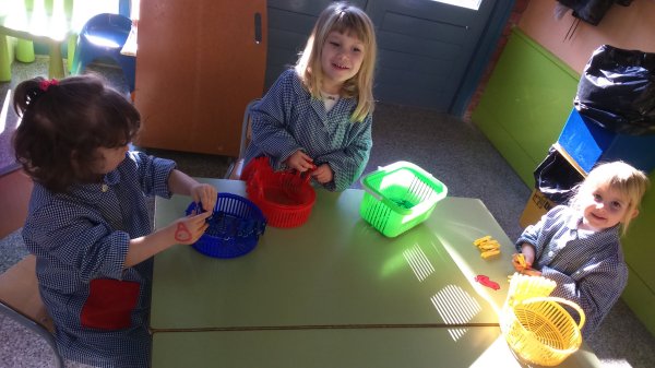També ens ha agradat molt fer classificacions per colors i treballar la motricitat fina amb pinces d’estendre la roba. Alguns hem pintat amb ceres de colors.