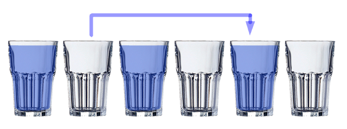 Primer, agafa l’ovella i l’emporta a l’altra banda del riu i torna; agafa el llop i va cap a l’altra banda, deixa el llop i torna amb l’ovella; deixa l’ovella i pren l’enciam per anar a l’altra riba, deixa l’enciam amb el llop i torna per agafar l’ovella amb la que va a l’altra banda. Ja ha acabat. ha passat ell i el llop, l’ovella i l’enciam.
