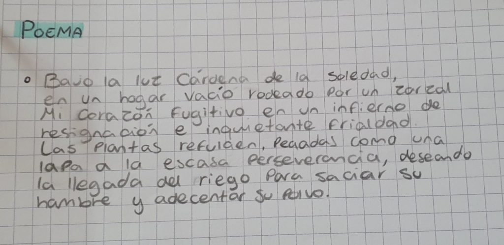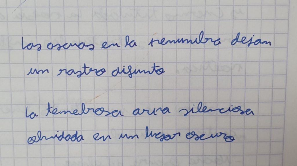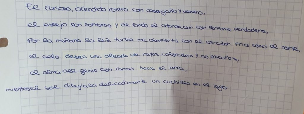 Una vez conseguidas, han tenido que buscar el significado de la gran mayoría y les he propuesto el reto: escribir un poema sin mirar ni métrica, ni rima, ni figuras retóricas en el que usaran el mayor número de palabras nuevas. Debían centrarse, a su vez, en conseguir que el lector imaginara aquello que estaban escribiendo como si se trataran de fotografías.