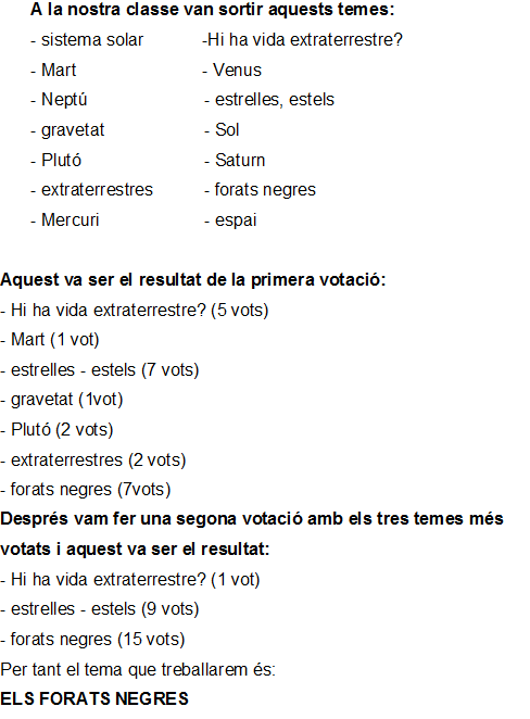 Més endavant, els alumnes van seguir enraonant i van recòneixer que també podia haver estat un reclam per justificar la realització del “Projecte d’Escola”. Donades totes les pistes analitzades van deduir que el tema general del mateix, era “l’ESPAI” i seguidament es va recollir un ventall de possibles subtemes del seu interés a investigar: ASTRONAUTES, EXTRATERRESTRES, FORATS NEGRES, CONSTEL•LACIONS, LA NASA, MART, JÚPITER, CONQUESTA DE LA LLUNA, SATURN, TECNOLOGIA ESPAIAL, TERRA, SISTEMA SOLAR …