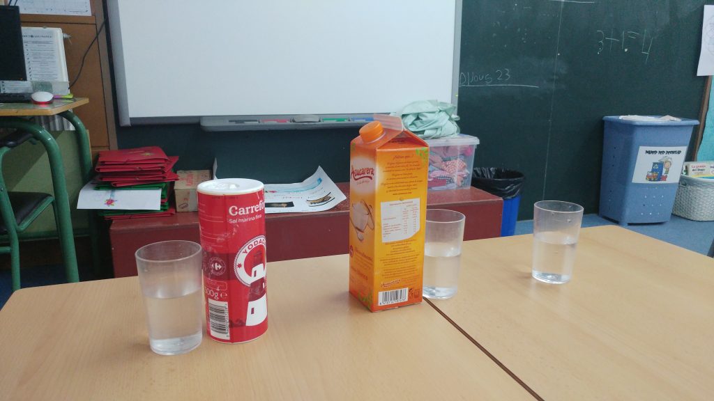 Seguim experimentant, avui hem fet unes dissolucions molt simples, aigua i sal/sucre amb aigua. Hem fet les nostres hipòtesis del que pensavem que passaria al barrejar-les i hem comprovat que amb els nostres sentits no podem diferènciar-les, sols si fem servir el sentit del GUST. I el més divertit és que hi havia qui volia beure’s els gots i no sols el de l’aigua dolça.