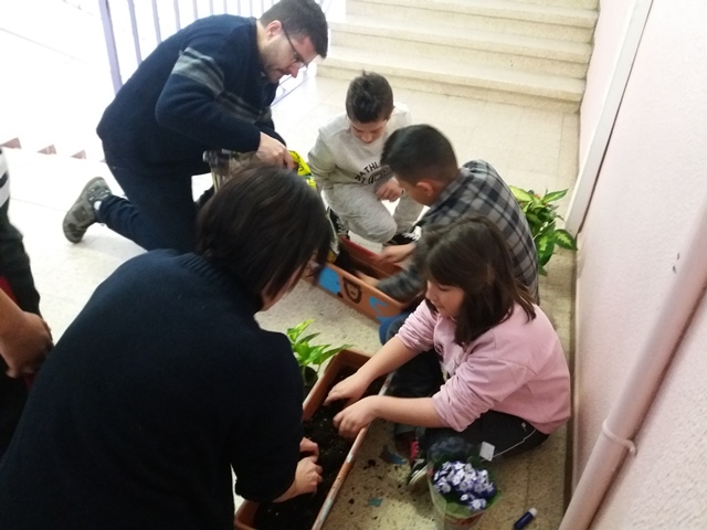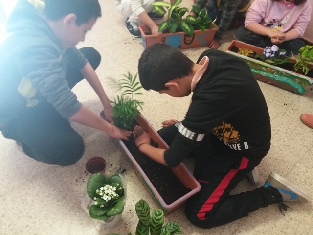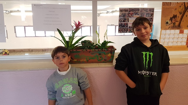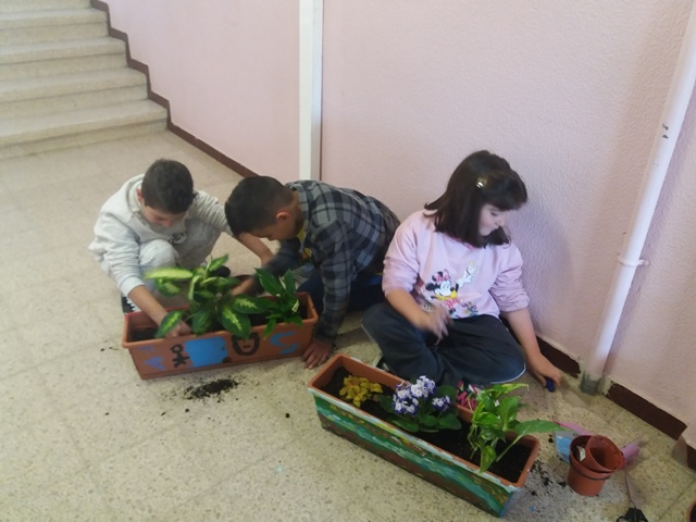 Aquest mes de gener hem plantat plantes d’interior en les jardineres, que vam pintar al desembre, per col·locar-les sobre la lleixa al costat dels vidres del passadís.