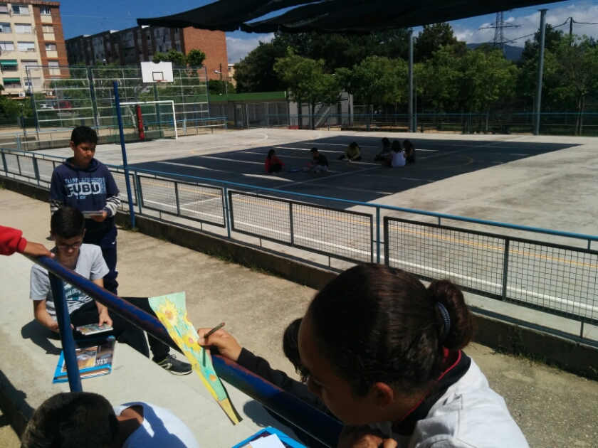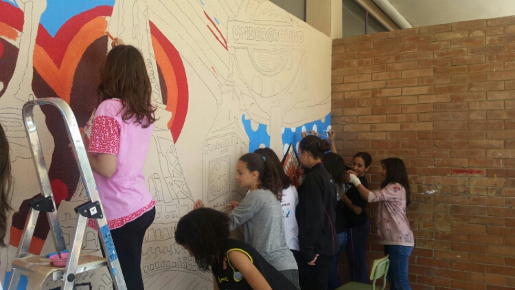 Avui els nens i nenes de sisè farem la classe de plàstica al pati!  Així, mentre uns dibuixen, altres anem acabant el mural!