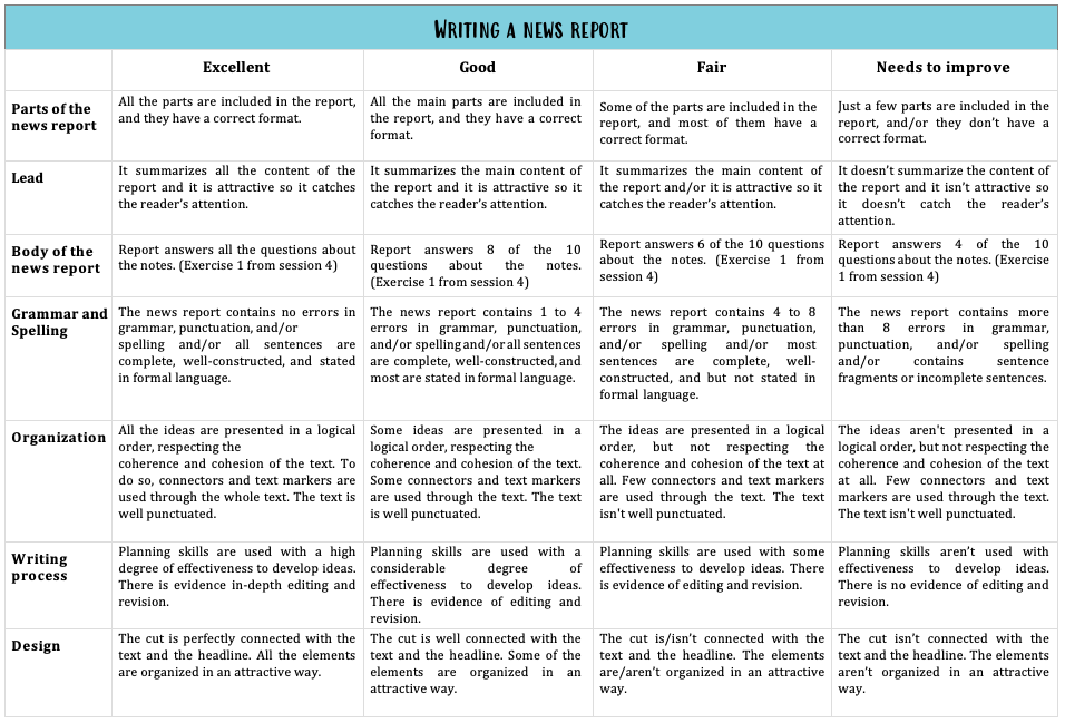 4- Here you have a rubric that will guide you in your writing task. It is what we will use to evaluate the news report.