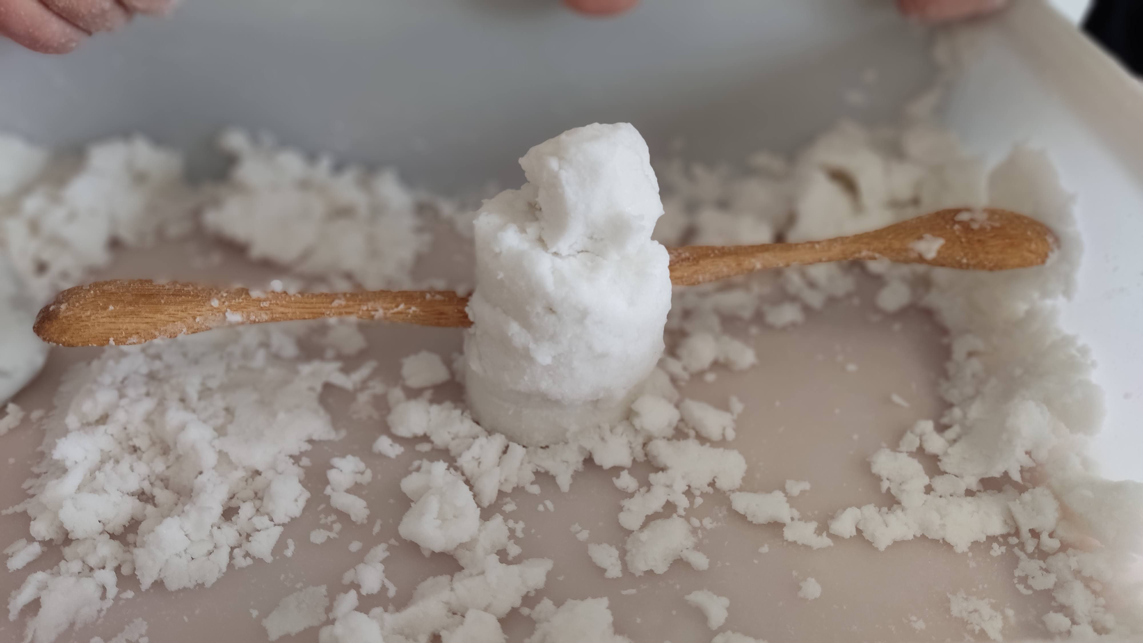 Quan ja portàvem una estona pastant el bicarbonat amb l’aigua que anàvem afegint amb un polvoritzador, ens ha quedat una textura i consistència molt semblant a la de la neu.