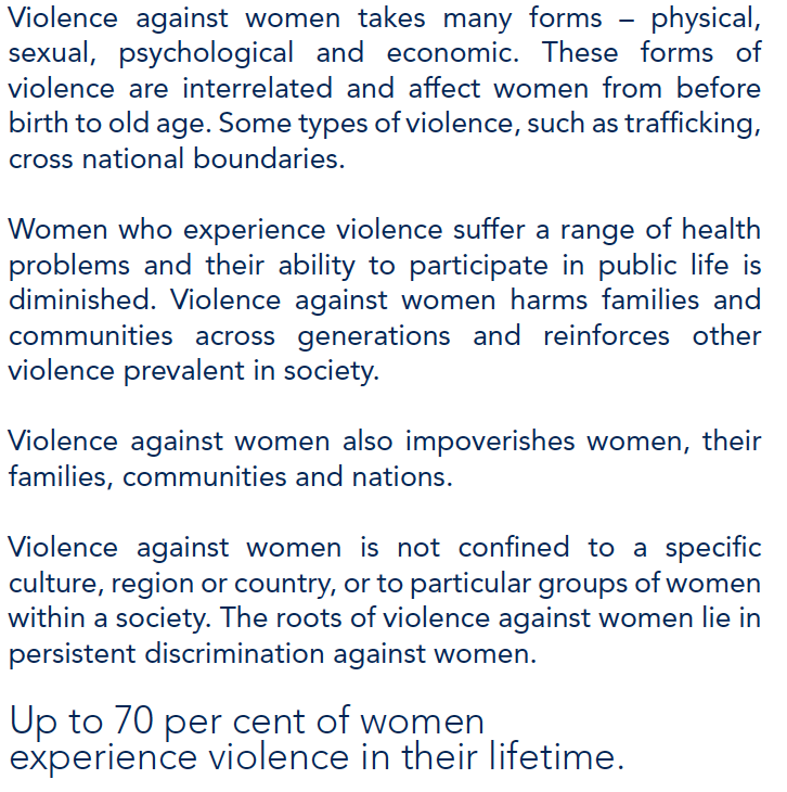 In groups of 2/3 you are going to read about the different types of violence women around the world suffer. Think about how they affect women and what people can do to eliminate them.