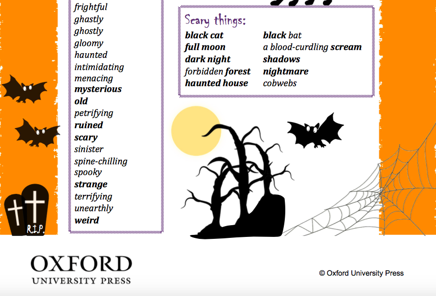 1. We are going to read some Halloween poems. First, listen to the teacher as she reads them. What Halloween words do you know? Write them down.