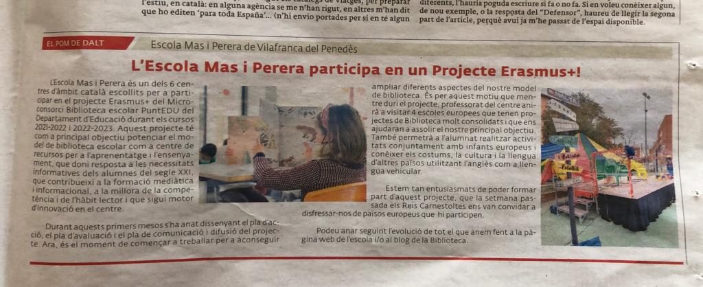 Som notícia a la secció “EL POM DE DALT” Publicat el 6 de març de 2022 per Escola Mas i Perera Aquesta setmana SOM NOTÍCIA a la secció “El pom de dalt” del diari comarcal el 3 de vuit. Us convidem a que llegiu la notícia que parla de la participació de l’escola en el Projecte Erasmus+!