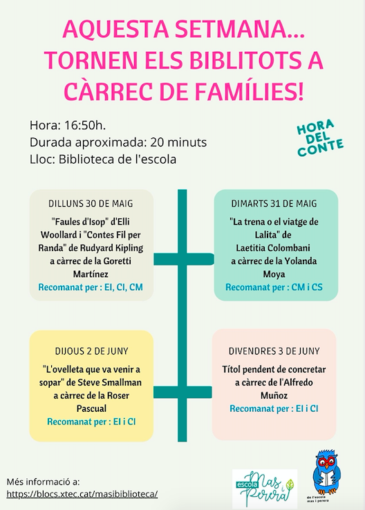 Tenim un gran notícia per explicar-vos! I és que la setmana vinent tornen els BIBLITOTS a la Biblioteca de l’escola! Aquesta vegada els contes seran explicats per famílies de l’escola!