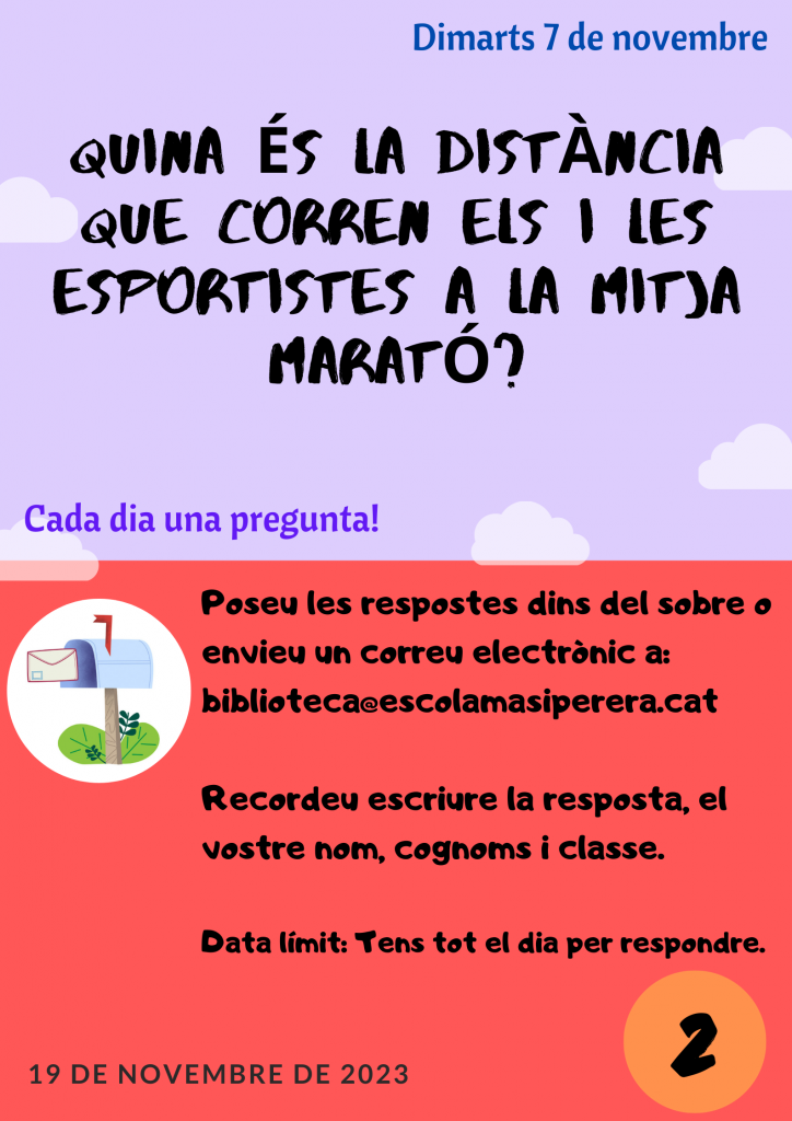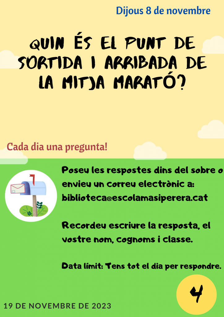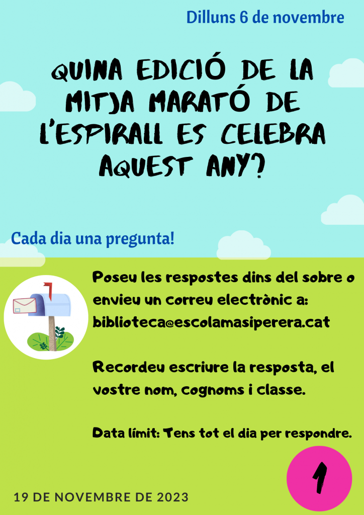 Cada dia de la setmana del 4 de novembre, aquí a la pàgina web de l’escola, al blog de la Biblioteca i a la cartellera de l’entrada de l’escola, us proposarem una pregunta sobre la Mitja Marató de l’Espirall.