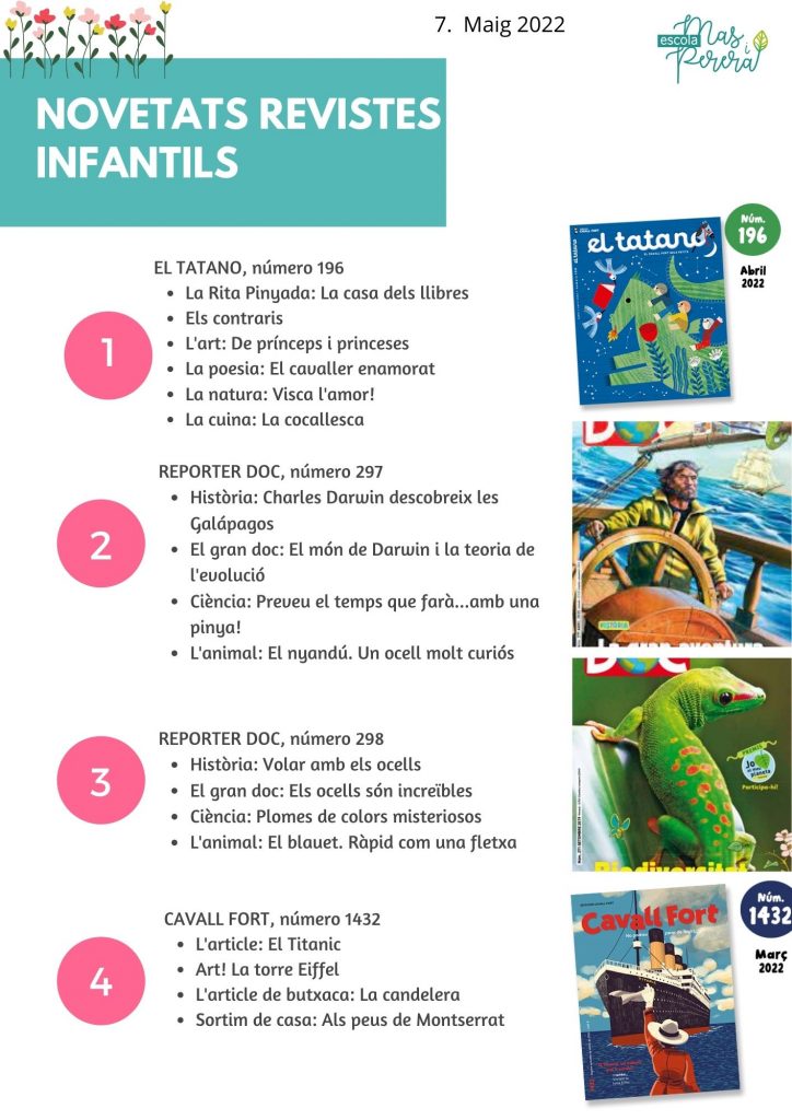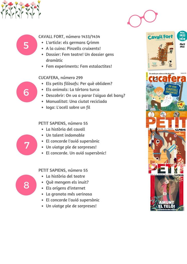 Heu sentit a parlar mai de Cristóbol Balenciaga, l’arquitecte de la moda? Coneixeu el detectiu Conan? Voleu jugar amb diferents activitats relacionades amb Sant Jordi? Sabeu per què tenim gasos? Voleu saber més coses dels GEGANTS? Trobareu les respostes a totes aquestes preguntes i més, en les revistes que ens han arribat d’aquest mes d’ABRIL.