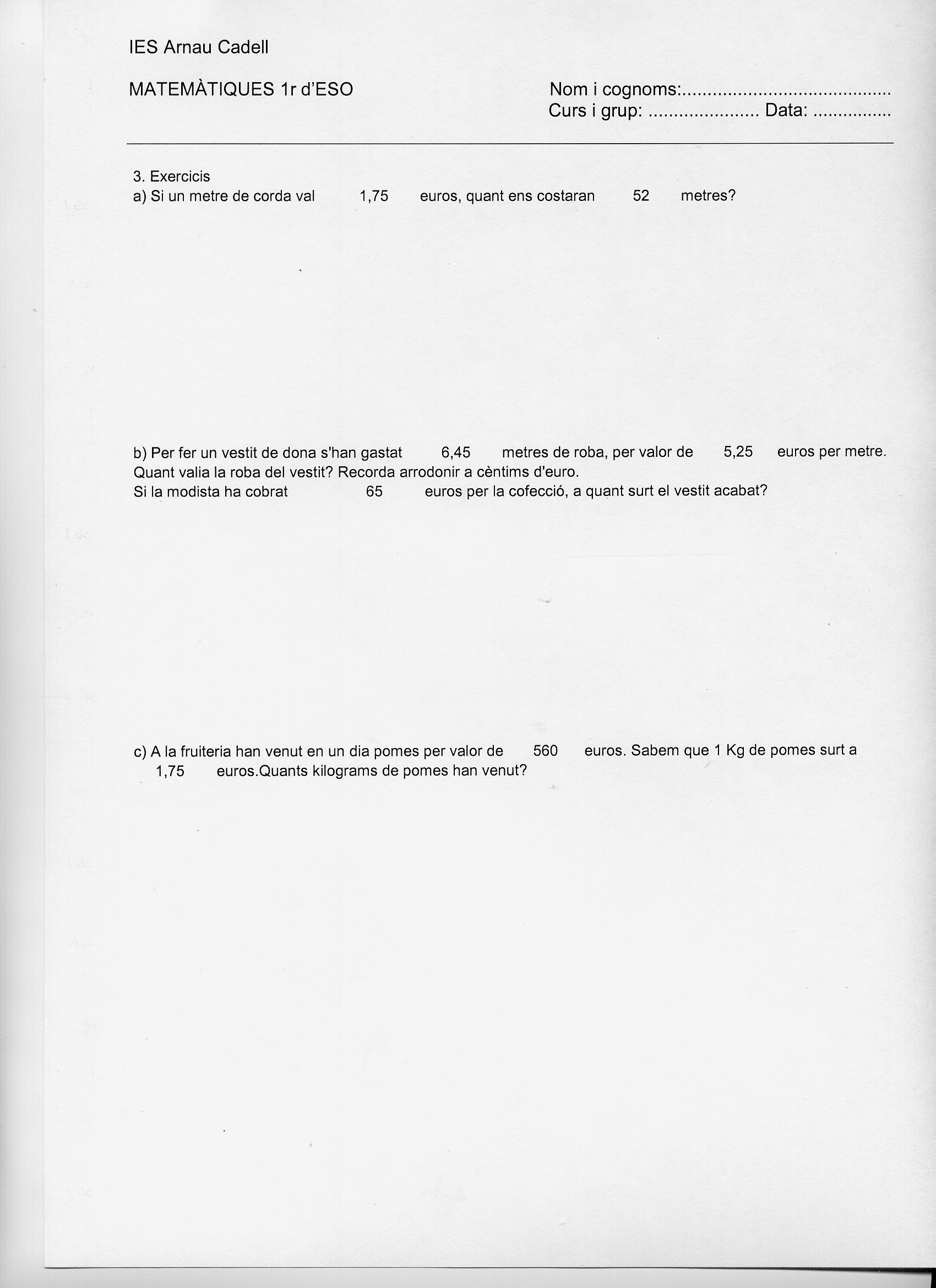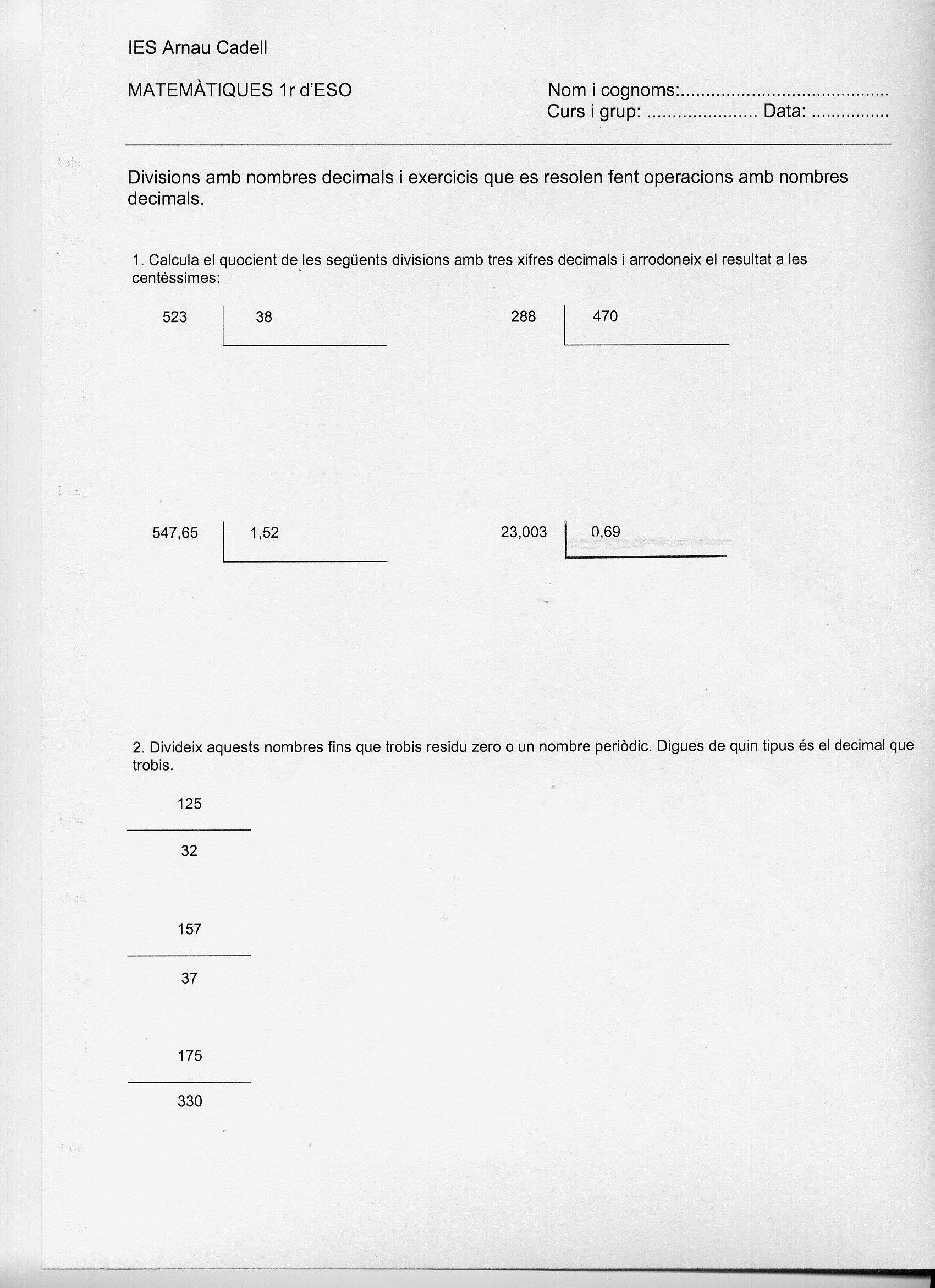 Full d’activitats amb divisions i exercicis i les seves solucions.