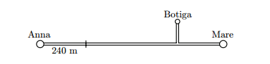 8-. L’Anna surt de casa per anar a veure la seva mare. Quan ha fet la quarta part del camí, ha recorregut 240 m. Quan ha fet tres quarts del cam´ı, es desvia per anar a una botiga, a comprar un regal, i després torna al camí principal. La distància que cal recòrrer entre el camí i la botiga ´es la vuitena part de la que hi ha entre la casa de l’Anna i la casa de la seva mare. Quina distància haui`a recorregut en total l’Anna quan arribi a veure la seva mare?.