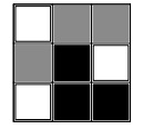 1-. En David ha pintat els nou quadrats de la figura amb els colors negre, blanc i gris. Quants quadrats, com a mínim, ha de repintar d’un altre color per a aconseguir que cap dels quadrats que tenen un costat com´u no tinguin el mateix color?