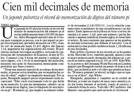 Com anuncia el titular, un japonès, Akira Haraguchi havia estat capaç de memoritzar fins a 100.000 dígits de pi. Amb aquesta marca, superava el seu registre anterior, assolit l’any 1995, en el que havia arribat a 83.431 xifres decimals. Haraguchi va començar a recitar la seva enumeració el dia 3, a les 9.00 del matí a una sala de conferències de l’Ajuntament de Kisarazu, a l’est de Tokyo, i va finalitzar, sense cap errada, a les 1.30 hores de la matinada. Tot i comptar amb la supervisió d’un equip de funcionaris municipals per comprovar la validesa de la seva proesa i enregistrar en video tot el procés, incloses les pauses de 5 minuts que va fer cada dues hores per anar al servei i menjar boles d’arròs, el seu rècord no ha estat reconegut pel llibre Guinnes ni per la llista de rècords matemàtics esmentada anteriorment.