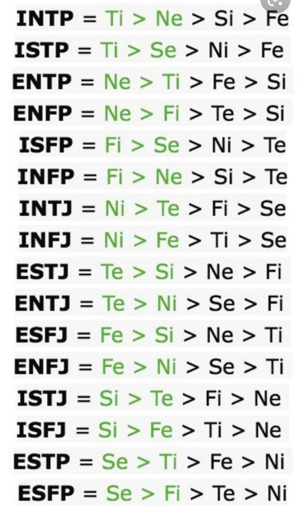 A continuació, mirem la taula següent, on es mostra l’ordre de les funcions cognitives de cada tipus MBTI. En aquesta taula veiem tots els tipus de personalitat MBTI amb les funcions cognitives que més utilitza cadascun, ordenades de més dominant a menys dominant.