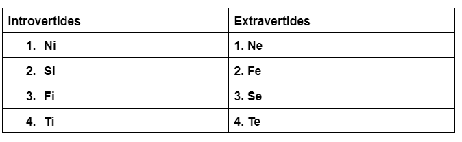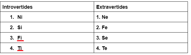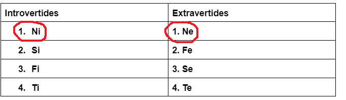 1. L’individu ha d’escollir, dels dos grups, quina funció cognitiva que té al primer lloc el representa més i se sent més identificat. En aquest cas, l’individu hauria d’escollir entre Ni o Ne.
