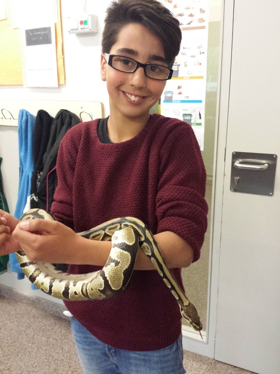 En un altre moment ens va parlar sobre les serps. La serp té els sentits repartits de manera diferent: elles tenen la llengua per olorar, agafen les bactèries i es fan una imatge al cervell. A part com que són de sang freda no veuen com nosaltres, sino per punts; els vermells son menjar i els blaus objectes o coses que no es poden menjar. Elles escolten per la panxa, senten les vibracions. La serp que ens va portar era família de la serp més gran del món, una anaconda de nou metres de llargada, però aquesta serp era més petita i tenia una qualitat que era semblant a la de l´estruç.