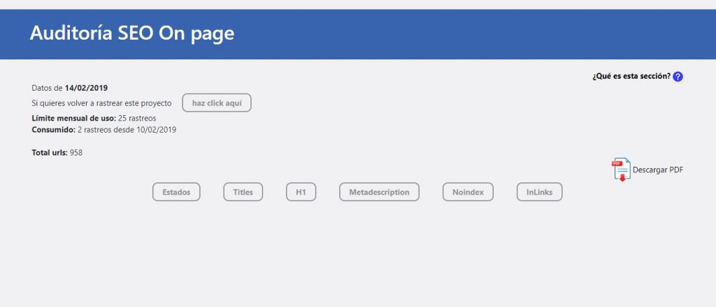 Podràs fer un màxim de fins a 25 rastrejos mensuals i podràs veure una llista de URLs del teu lloc web per a veure més detalls de cadascuna d’aquestes pàgines del teu web.