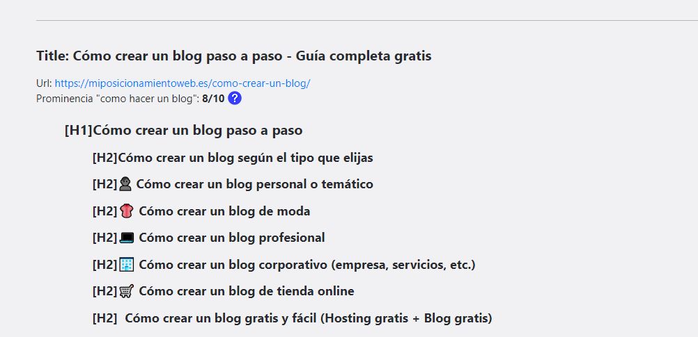 D’una banda obtindràs les dades de la fórmula WDF**DF d’aquesta keyword en concret, juntament amb una gràfica (depenent del que seleccions: una, dues o tres paraules) i a més obtindràs l’estructura dels encapçalats que utilitza la teva competència que està millor posicionada amb aquesta paraula clau, tal com et mostro en aquest exemple:
