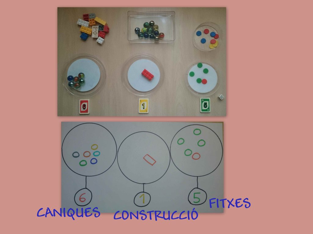 QUAN ACONSEGUIU TENIR-LOS TOTS MUNTATS ELS DIBUIXEU DINTRE D’UN CERCLE, NO US OBLIDEU D’ESCRIURE TAMBÉ EL SEU NÚMERO AL COSTAT. TAMBÉ PODEU ESCRIURE LES COSES QUE HI HEU POSAT (BOTONS, PEDRES…). FIXEU-VOS BÉ EN LES QUANTITATS, FORMES, MIDES, COLORS… I AIXÍ US QUEDARÀ BEN IGUAL. A LES FOTOS D’AQUÍ BAIX TENIU UN PETIT EXEMPLE DEL JOC: