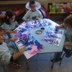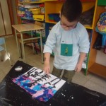 Finalment, vam fer una esquitxada amb pintura blanca per imitar la neu. Això sí que ens va agradar: vam tapar una taula amb plàstic perquè tal i com diu el nom, vam fer una bona esquitxada de pintura per tot arreu!