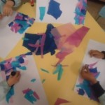 Cada nen i nena va marcar en un full una línia que separava el cel de la terra. Un cop ben delimitat, va fer un collage de papers de seda de colors freds al cel.