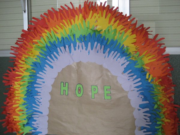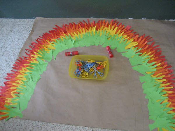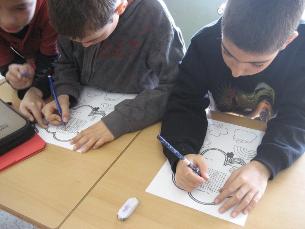 Here you are the first one: a craft. They drew their hands on coloured paper and made a big rainbow. Now you can see it on a wall, in a corridor. Then, they did a wordsearch about Saint Patrick’s Day.