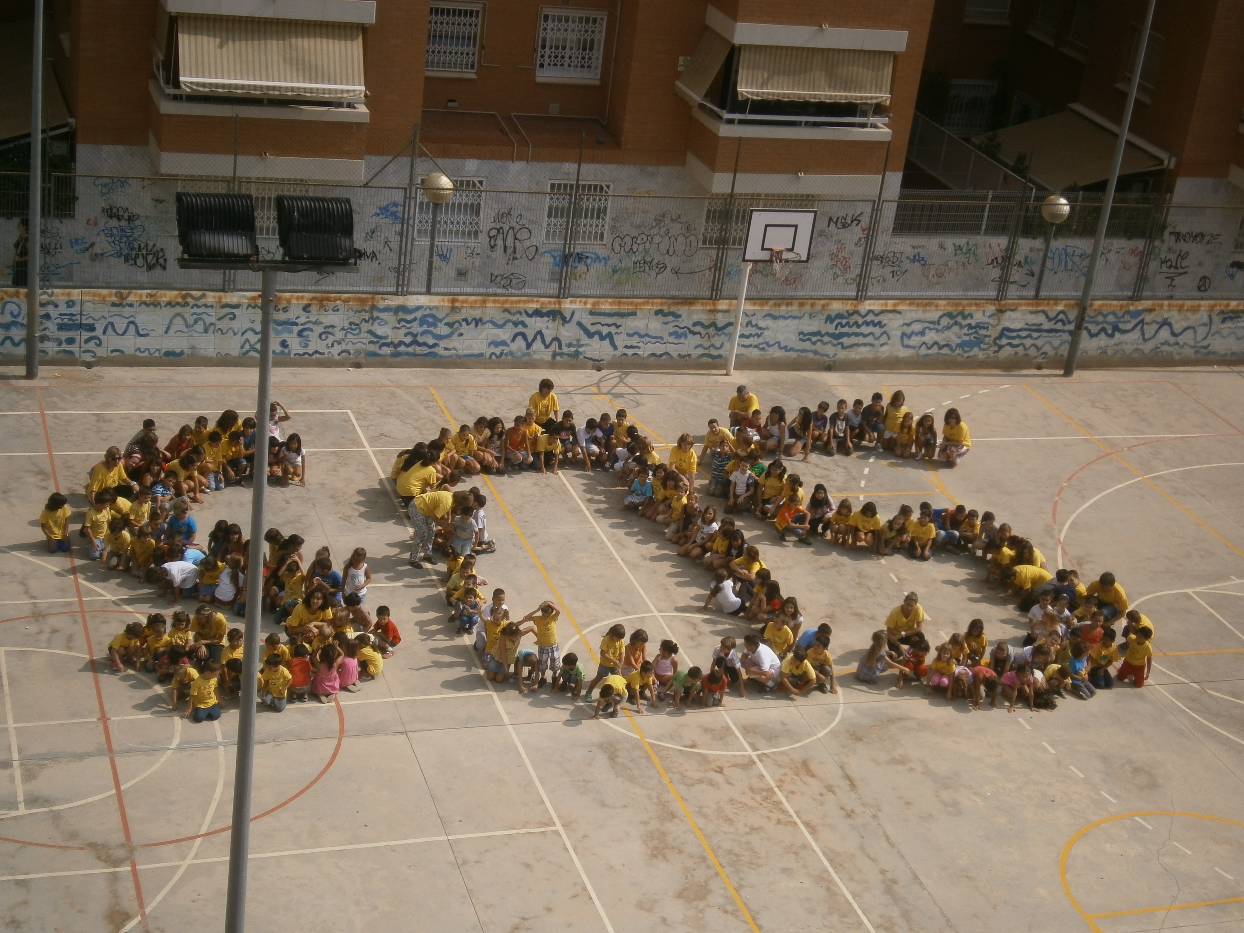 Avui, 1r dia del curs 2012/13, hem fet entre tots i totes un mural humà a la pista dibuixant les lletres SOS.