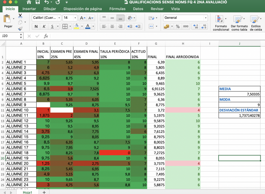 Àrea 4 4 de febrer de 2024Area 4 CCDMERITXELL BORDAS SANCHEZ EVIDÈNCIES E1: Full de càlcul amb MODA, MITJANA i DESVIACIÓ típica E2: Qualificacions amb rang de colors (Verd, bona qualificació – Vermell, baixa qualificació) d’aquesta manera serà molt visual. Pàgines: 1 2