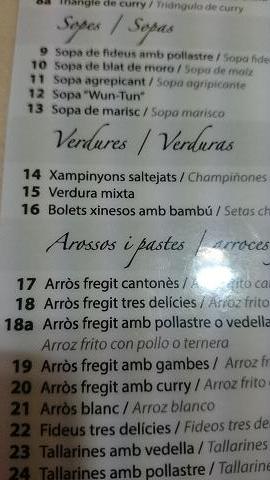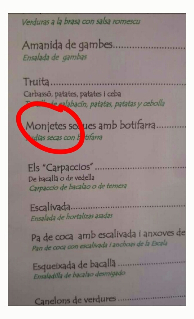 A la següent imatge veiem que monJetes no va amb J (ja que J va davant de A O i U, i la amb G davant d’E i I). Per tant hauria de ser mongetes. Aquesta foto i la tercera han estat fotografiades a a la carta del restaurant el nou estanc a l’Estanyol)