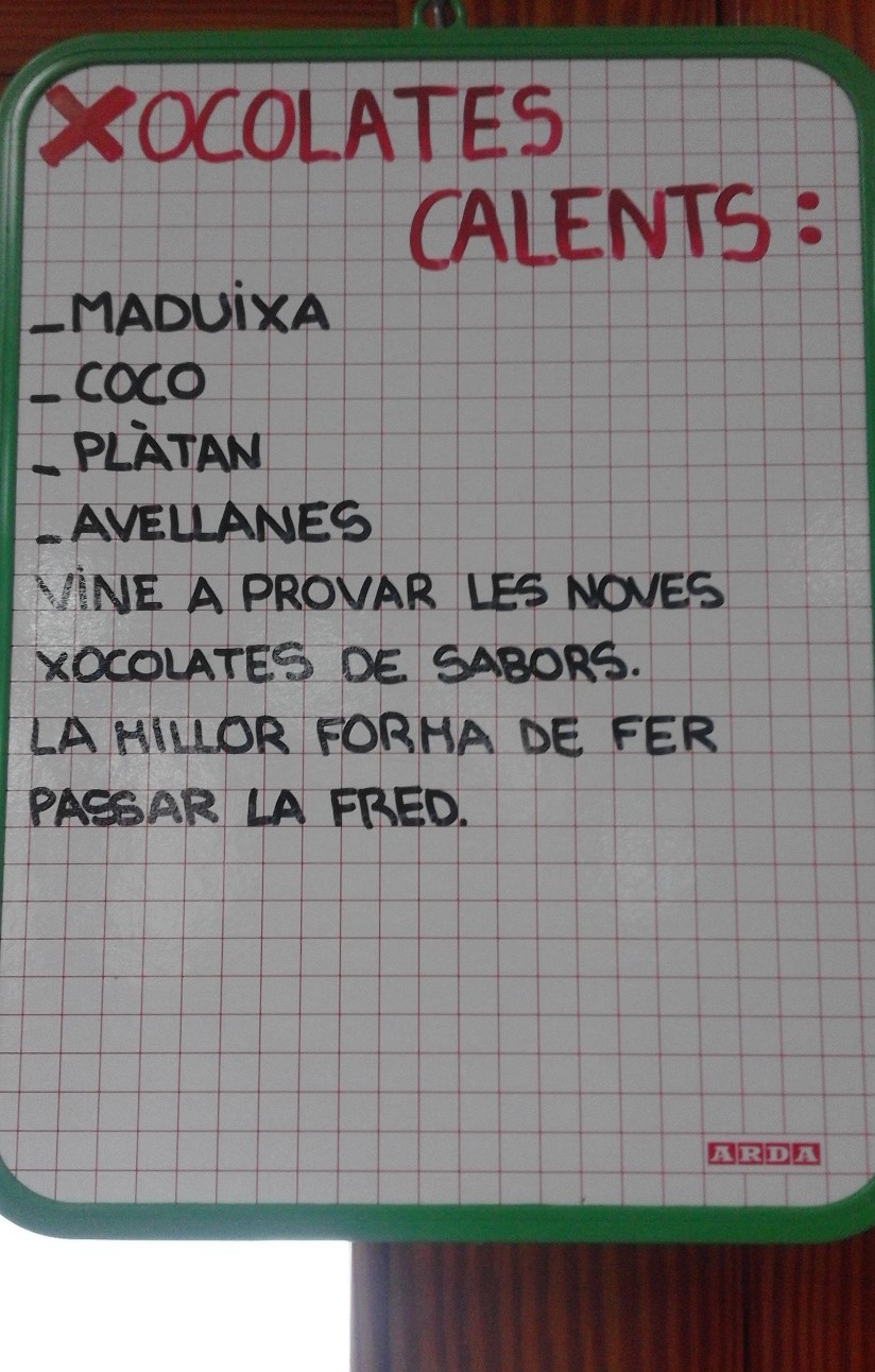En el títol del cartell diu –Xocolates calents-, xocolates és una paraula femenina, però en canvi l’adjectiu calents està en masculí. Com que xocolates és el nom i calents l’adjectiu hauria de concordar amb el nom. Així que haurien d’haver escrit xocolates calentes.