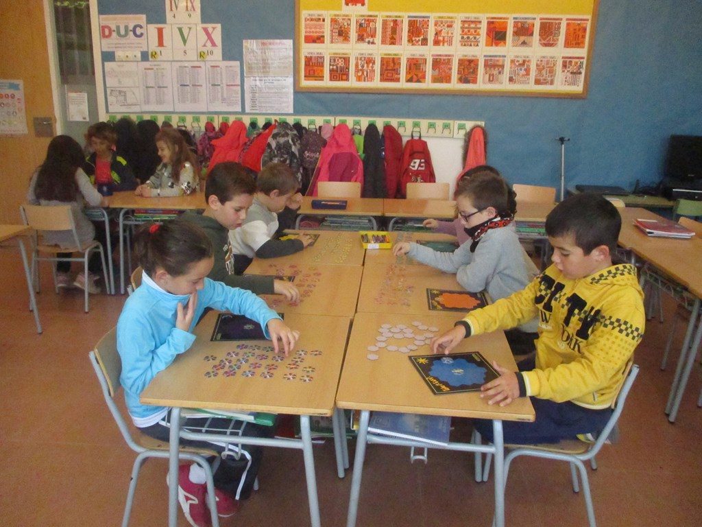 Al taller de matemàtiques estem treballant la descomposició del número 10 amb dues cartes. Per fer aquest treball utilitzem els bee-bots: programem el bee-bot indicant quants moviments ha de realitzar i en quina direcció perquè es pari en les dues cartes que formen la descomposició del número 10. Si el bee-bot realitza bé el recorregut guanyem les dues cartes i ho prova una altre company amb les cartes restant que encara queden sota del plàstic quadriculat.