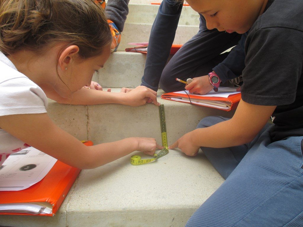 A matemàtiques estem treballant el sistema mètric i per poder aplicar els continguts treballats al nostre entorn hem decidit anar a mesurar diferents elements del pati amb una cinta mètrica. Amb les mesures que hem obtingut després hem anat a la classe i hem treballat les equivalències entre diferents unitats de mesura.
