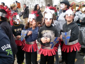 Els alumnes de 5e B s’han disfressat de gladiadors, com el nom de la classe. A les darreres sessions de plàstica hem confeccionat el casc, l’escut i una mena de faldilla per tapar la zona genital.