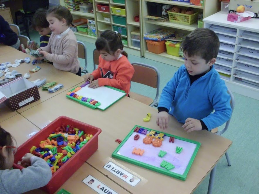 Els racons d’aprenentatges que realitzem són: identificar els noms dels nostres companys/es amb la seva foto, resseguir els noms, els números treballats, grafisme, classificació per colors, fer parelles de mitjons, jocs d’identificació i classificació de quantitat-grafia, seguir models de pius, ens familiaritzem amb lletres i números imantats, intentem confegir el nostre propi nom, joc del memori i construccions. Quina feinada que fem!!! Mireu com aprenem jugant!!