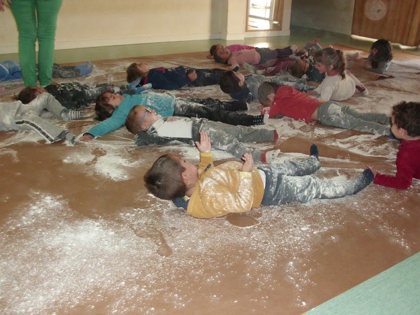 Els nens i nenes de P3 hem jugat amb farina. Ens hem estirat al terra i ens ha començat a caure farina per tot arreu com si fos neu. Hem tocat, hem experimentat, ens hem embrutat, hem dibuixat a sobre del paper d’embalar amb la farina amb els dits, amb el nostre propi cos i amb pinzells. Ens ho hem passat d’allò més bé i hem gaudit molt. Mireu, mireu!!!