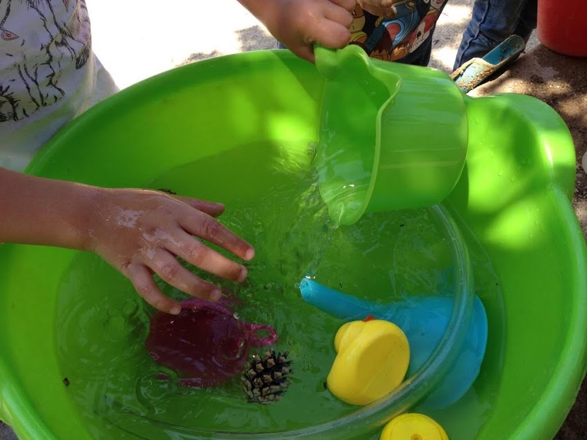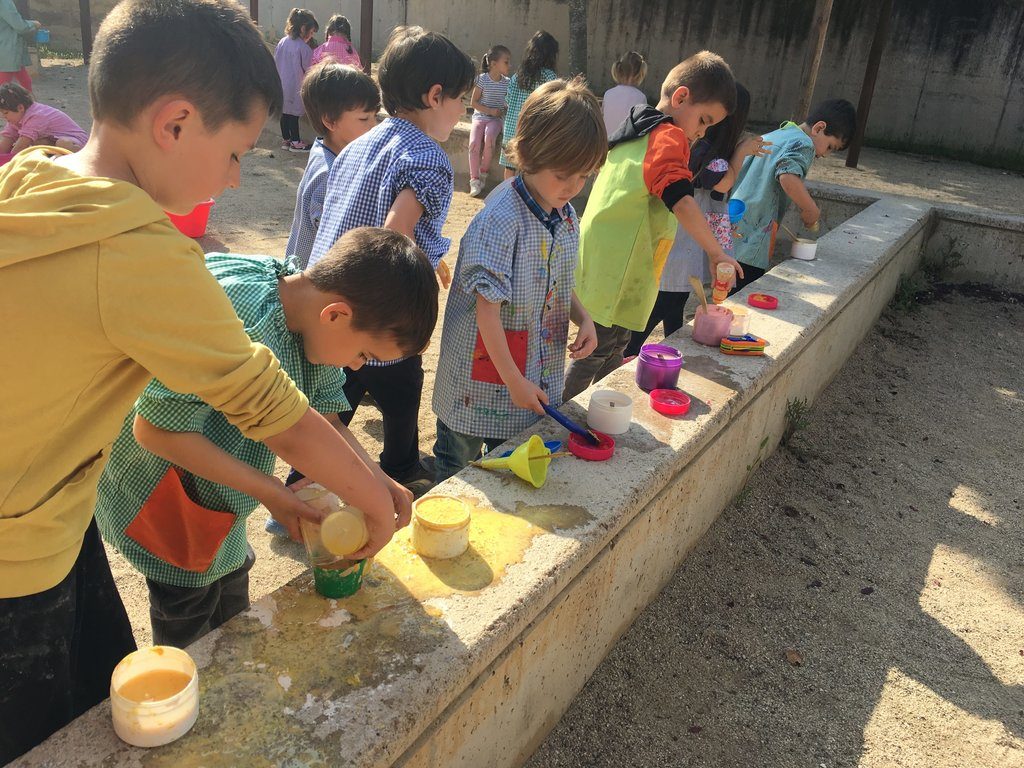 Aprofitant i gaudint del temps de primavera, hem tret l’ambient d’experimentació al pati. Hem interaccionat amb l’aigua amb diferents elements com: suros, pedres, ànecs de plàstic, i la disponibilitat de gran quantitat d’embuts, pots i mesures de diferents formes, dimensions, mànegues de diferent gruix i llargada, etc, promovent una gran riquesa experimental i d’aprenentatges.