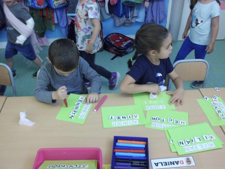 Pel que fa els racons de llengua. Confegim el nostre propi nom ordenant les lletres, el resseguim i l’escrivim. Fem parelles dels noms dels nens i nenes de la classe amb foto i sense foto, classifiquem els noms segons la lletra capitana “inicial”, decorem el nom dels nostres companys/es o el nostre propi…