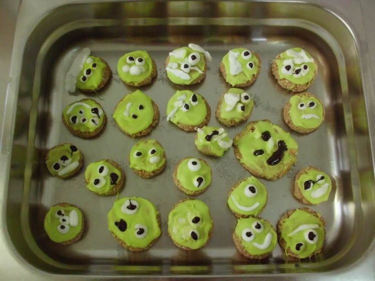 GALETES DE MONSTRES: Els nens i nenes han realitzat un taller de cuina on havien de realitzar la massa de les galetes per poder fer boles. Aquesta massa l’hem fet amb pols de galeta María i llet condensada. Després hem decorat la galeta amb xocolata blanca pintada de color verd i cada nen/a ha fet els ulls i boca amb fondant blanca. Mireu que maques han quedat!!!
