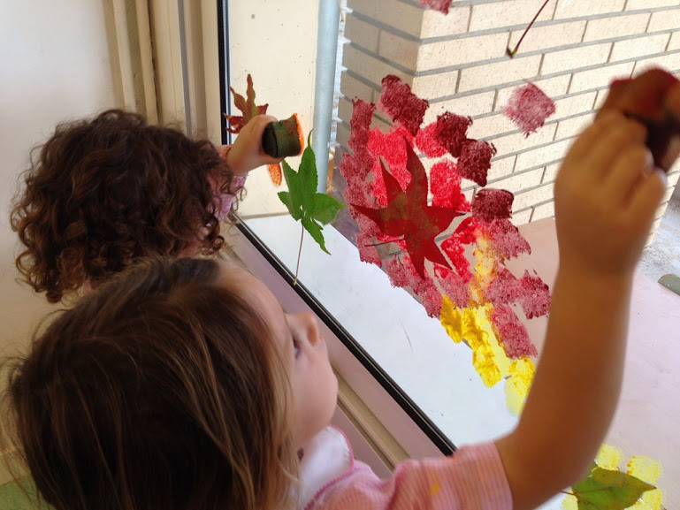 Els BABY MONSTERS decorem els vidres amb colors de la tardor. Estampem amb esponges al vidre sobre fulles enganxades, estampem les nostres mans sobre aironfix i també hi pintem lliurement.