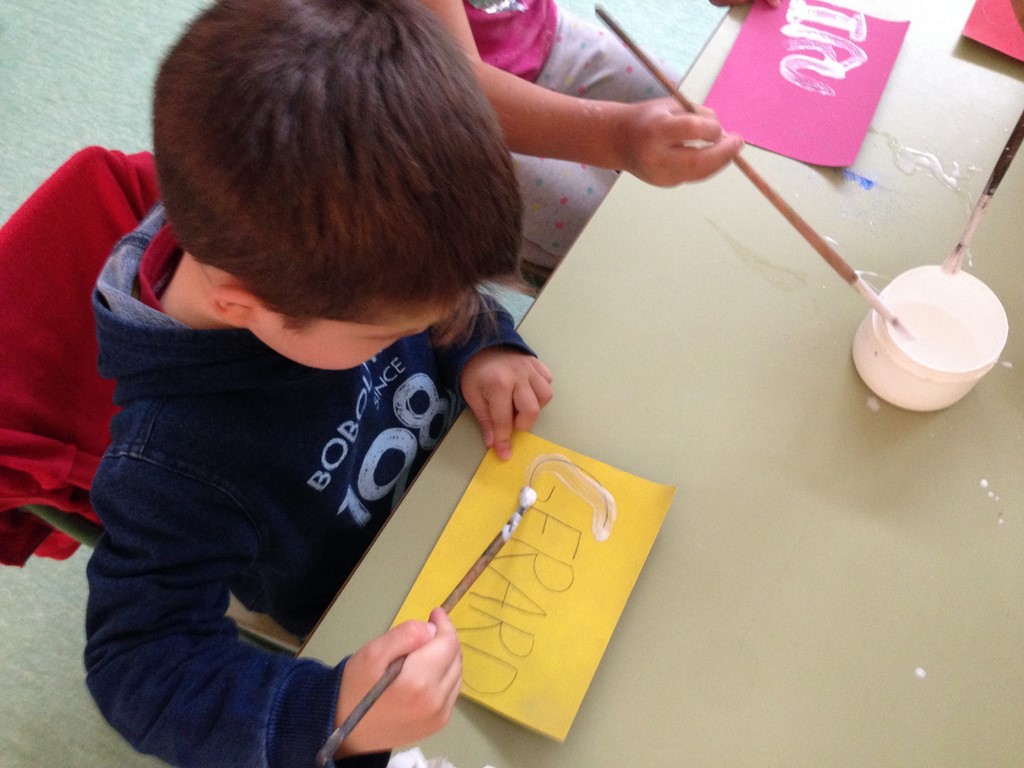 Pintem un cartró de color, resseguim el nostre nom amb cola i el decorem amb purpurina.