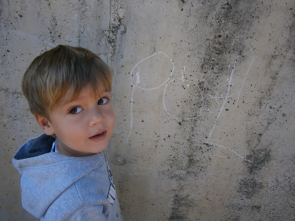 Escrivim la nostra inicial i el nom a la paret i al terra del pati.