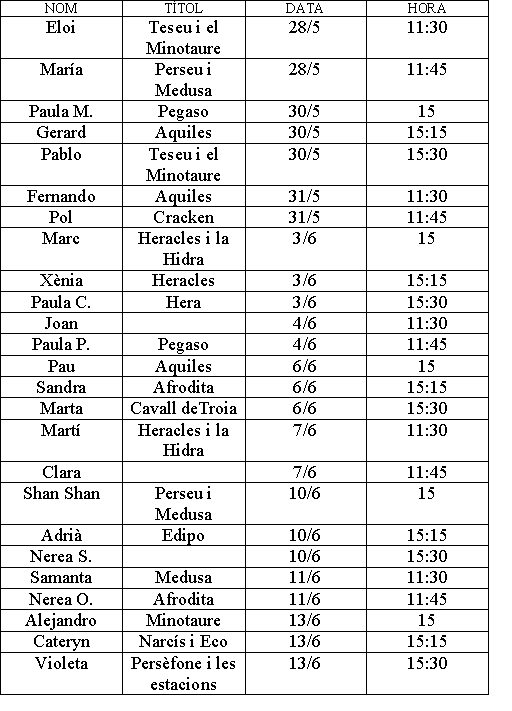 A causa de l’horari intensiu de juny hem hagut de canviar la data i l’horari d’algunes exposicions. Aquí deixo la nova taula modificada.